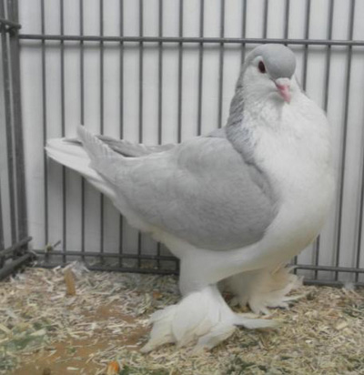 Abb.:Schauvoliere mit verschiedenen Farbenschlägen von Lahoretauben auf der Nationalen Rassegeflügel-schau 2005 in Dortmund